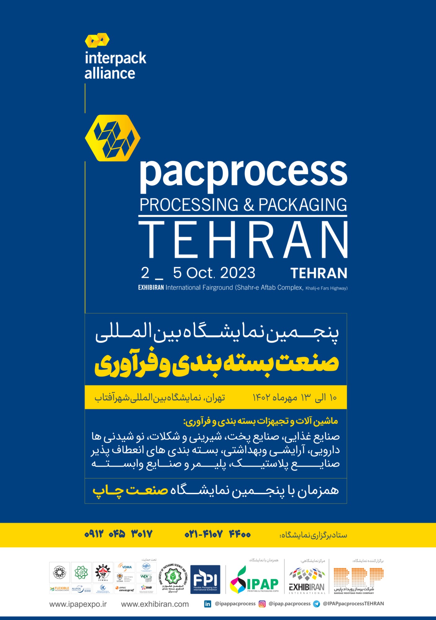 به اطلاع می رساند پنجمین نمایشگاه صنعت بسته بندی، چاپ و فرآوری از تاریخ ۱۰ الی ۱۳ مهر ماه سال ۱۴۰۲ در محل نمایشگاه های شهر آفتاب تهران برگزار خواهد شد.