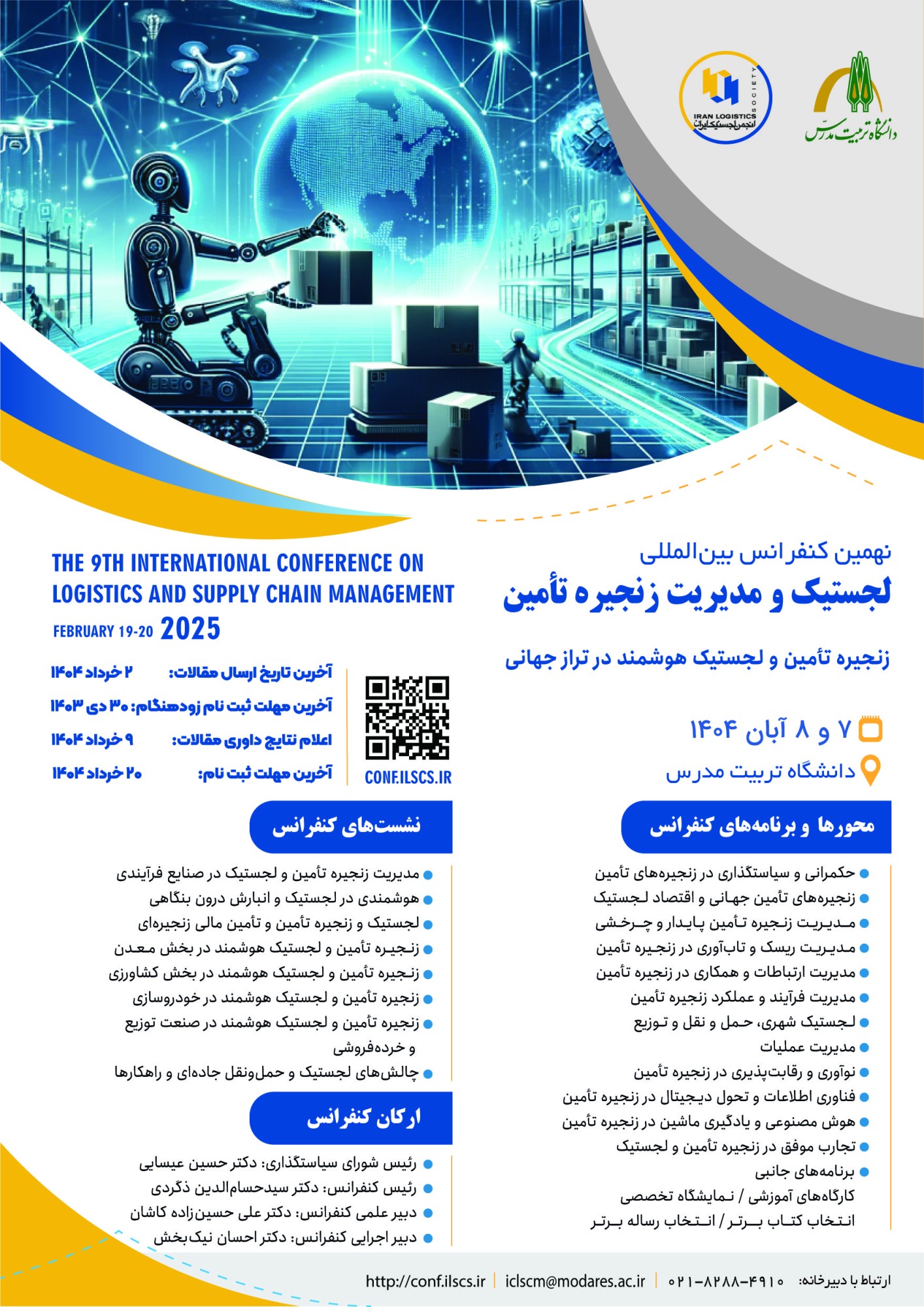 پیرو تصمیم شورای سیاستگذاری کنفرانس، به اطلاع شرکتکنندگان محترم نهمین کنفرانس لجستیک و زنجیره تأمین میرساند که کنفرانس در روزهای چهارشنبه 7 آبان و پنجشنبه 8 آبان 1404 برگزار خواهد شد. روز اول به ارائه مقالات کنفرانس به صورت مجازی و روز دوم به برگزاری پنلها و کارگاههای تخصصی کنفرانس اختصاص به صورت حضوری در محل دانشگاه تربیت مدرس اختصاص خواهد داشت.